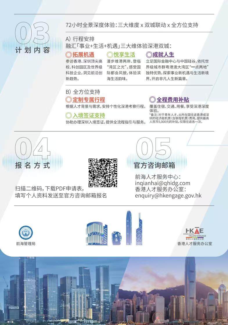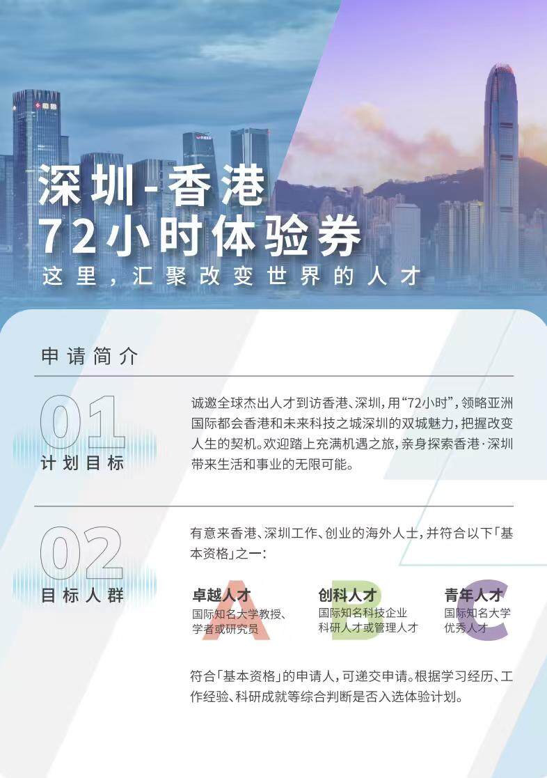 “深港72小时体验券”的目的使用东谈主群是“专门来香港、深圳责任、创业的国外东谈主士”,并要点聚焦“超卓东谈主才、创科东谈主才和后生东谈主才”三大群体。