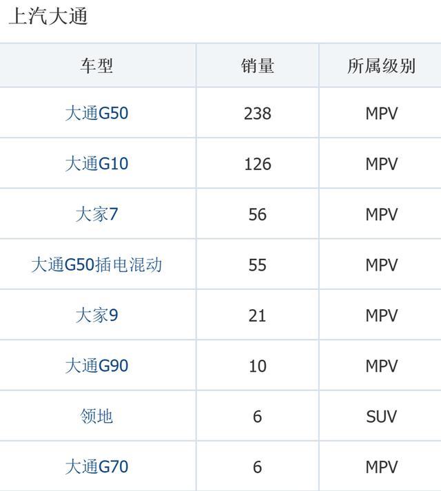 其中品牌里面销量最高的大通G50,月销也仅有238台,而定位中高端的人人7、人人9,以及旗舰燃油MPV大通G90等车型,单月销量均只须几十台,在竞争热烈的MPV商场里,真的处于无东谈主问津、毫无存在感的景色。