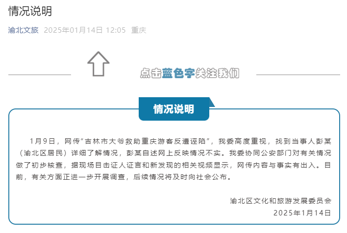 1月9日,网传“吉林市大爷挽救重庆游客反遭诬蔑”,我委高度醉心,找到当事东说念主彭某(渝北区住户)翔实了解情况,彭某自述网上响应情况演叨。我委协同公安部门春联系情况作念了初步核查,据现场目睹证东说念主证言和新发现的干系视频高慢,网传实质与事实有收支。现在,联系方面正进一步开展拜访,后续情况将实时向社会公布。