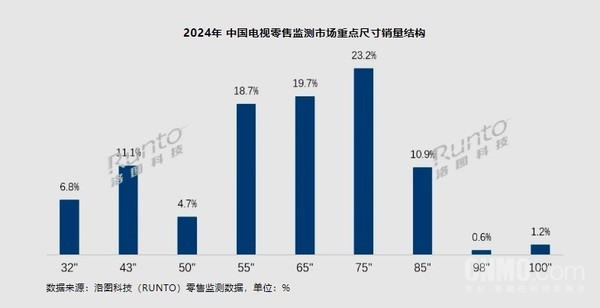 尺寸方面,2024年,75英寸电视的销量占比达到23.2%,超过占比19.7%的65英寸,成为新晋第一大尺寸。值得一提的是,2023年65英寸才成为市集第一尺寸。