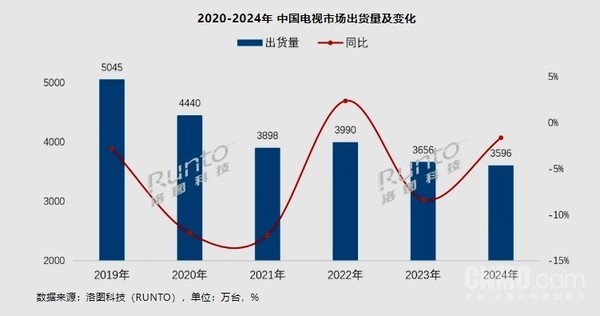 洛图科技(RUNTO)最新发布的《中国电视市集品牌出货月度跟踪》数据露馅,2024年全年,中国电视市集品牌整机出货量为3596万台,同比2023年下跌1.6%,刷新了从2010年开动十余年来的中国市集出货量新低。不外,2024年中国电视市集的零卖额为1202亿,同比增长12.3%。