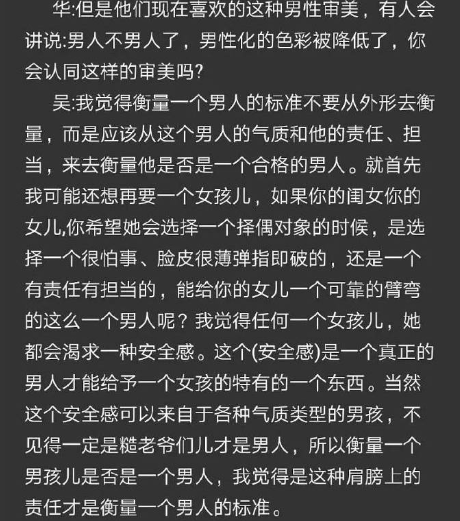比如训斥吴京当年借exo计划性别的说法,其实完全是以文害辞,吴京说“我以为接头一个男东说念主的表率不要从外形去接头,而是应该从这个男东说念主的气质和他的职守、担当,来往接头他是否是一个及格的男东说念主”终点大方多礼;