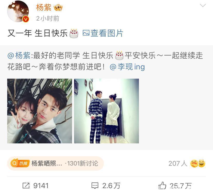 和以往庆祝相通,杨紫依旧转发19年头度为李现庆生时的动态,还附上两张合照,祝李现诞辰昂扬。